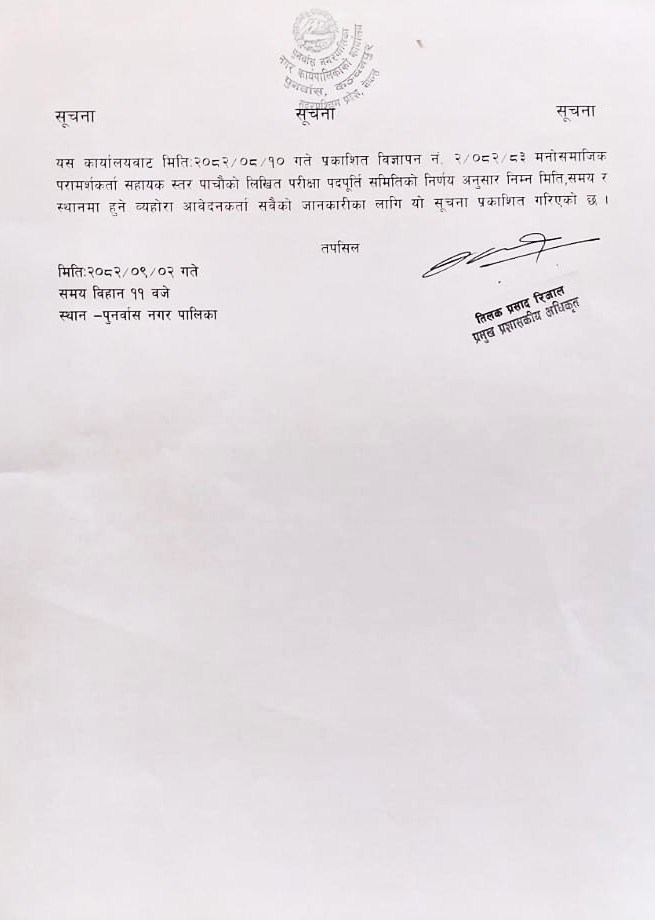 » मनोसामाजिक परामर्शकर्ता पदको लिखित परीक्षा संचालन सम्बन्धी सम्बन्धीत सबैमा सूचना ।