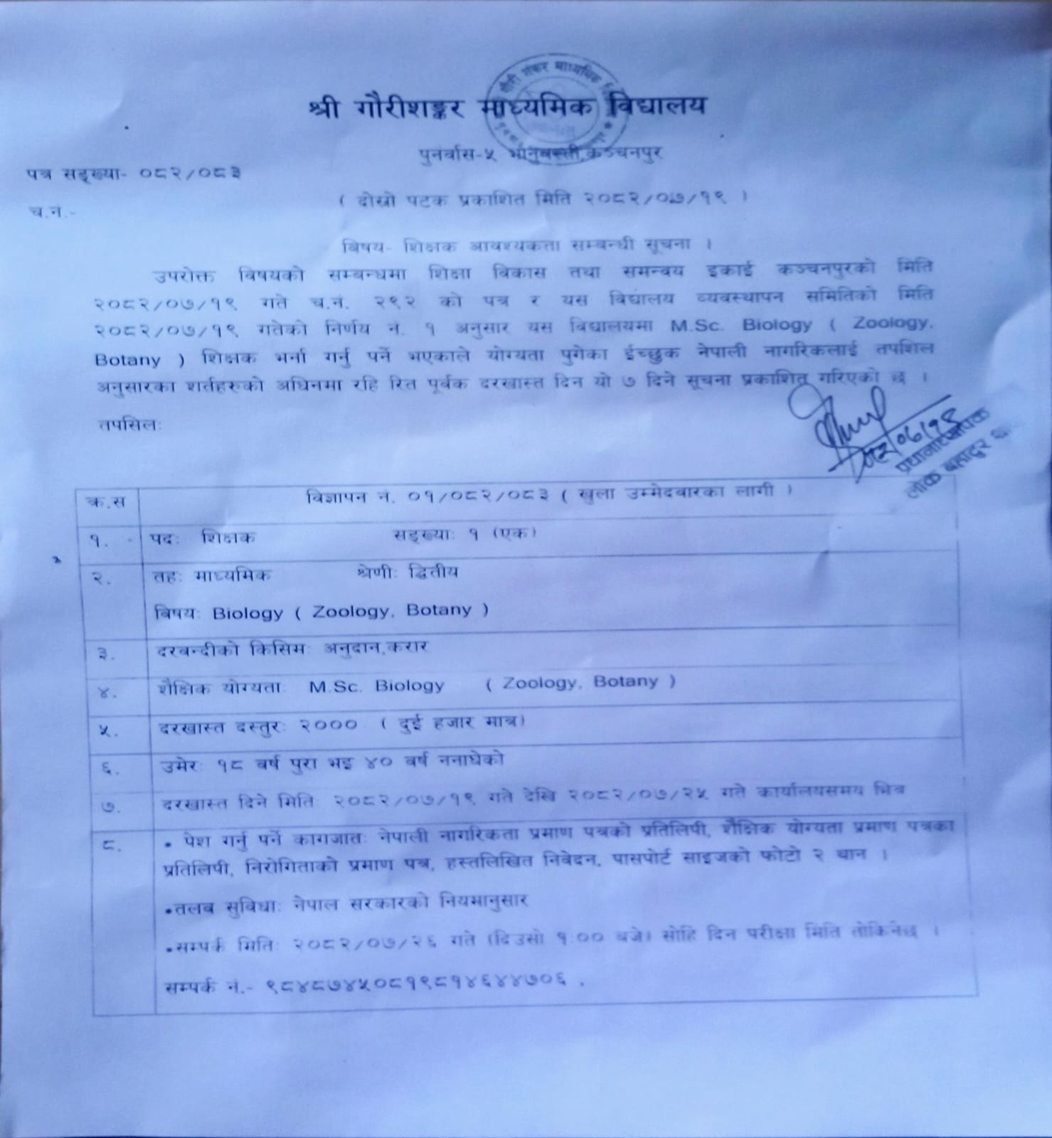 गौरीशंकर मा वि को शिक्षक आवश्यक्ता सम्बन्धी दोस्रो पटक प्रकाशित सूचना ।