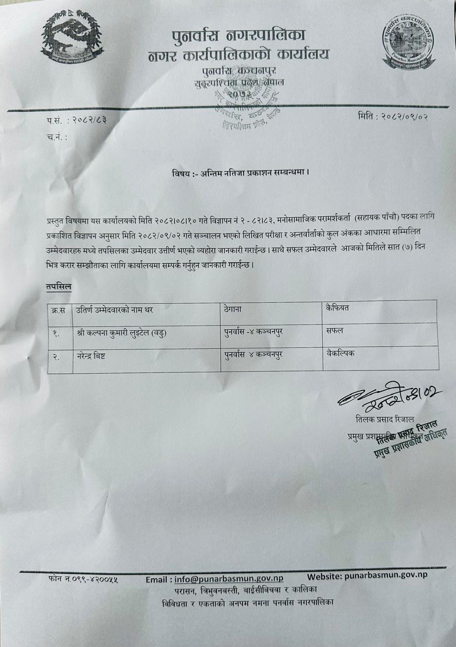» मनोसामाजिक परामर्शकर्ता पदको अन्तिम नतिजा प्रकाशन सम्बन्धमा ।